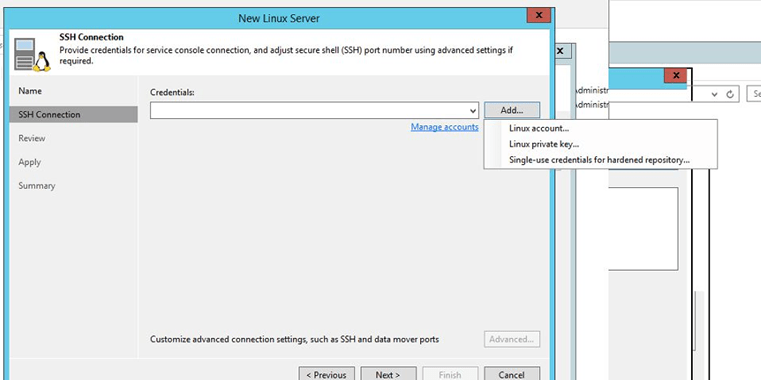 We will use “single-user credentials for hardened repository” this way the credentils will not be stored and will be discarded once the veeam has a connection.