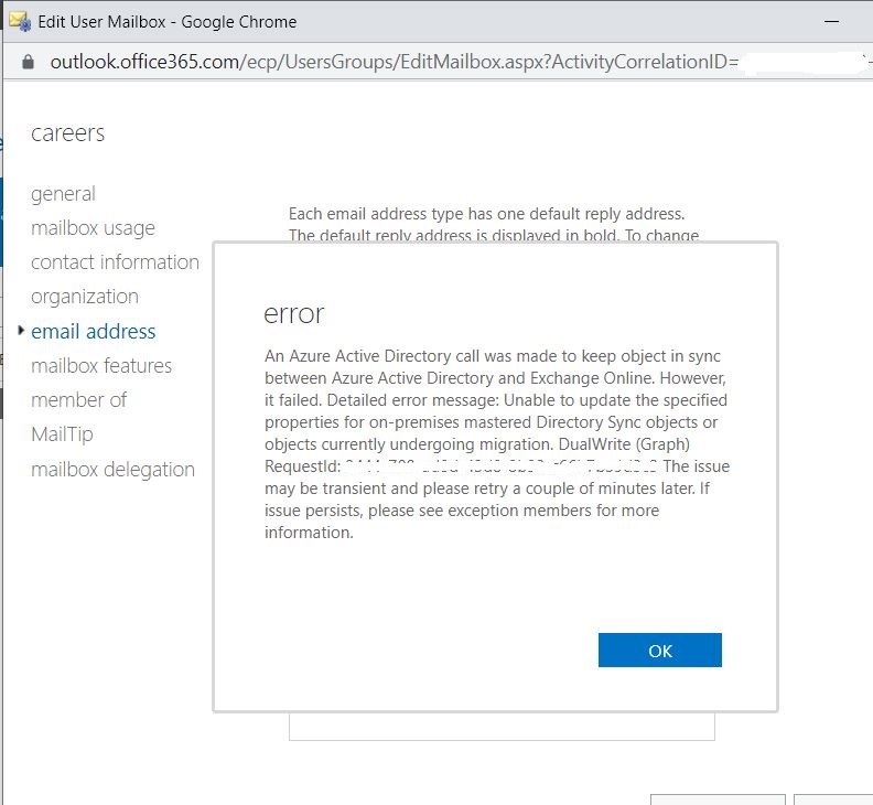 A few days ago , I was asked to change Primary SMTP email for a client, I have tried to change the primary SMTP from cloud and faced the below error:An Azure Active directory call was made to keep object in sync between Azure Active Directory and Exchange Online