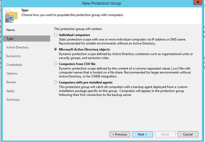 We will access our VBR console and go to Inventory, and then Physical Inventory and then create a new protection group :