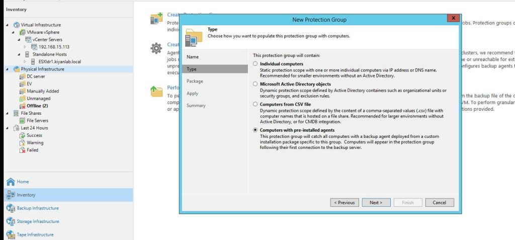 Connect to your VBR console and create a new protection group by accessing, Inventory and right click on Physical Infrastructure and selecting New Protection Group