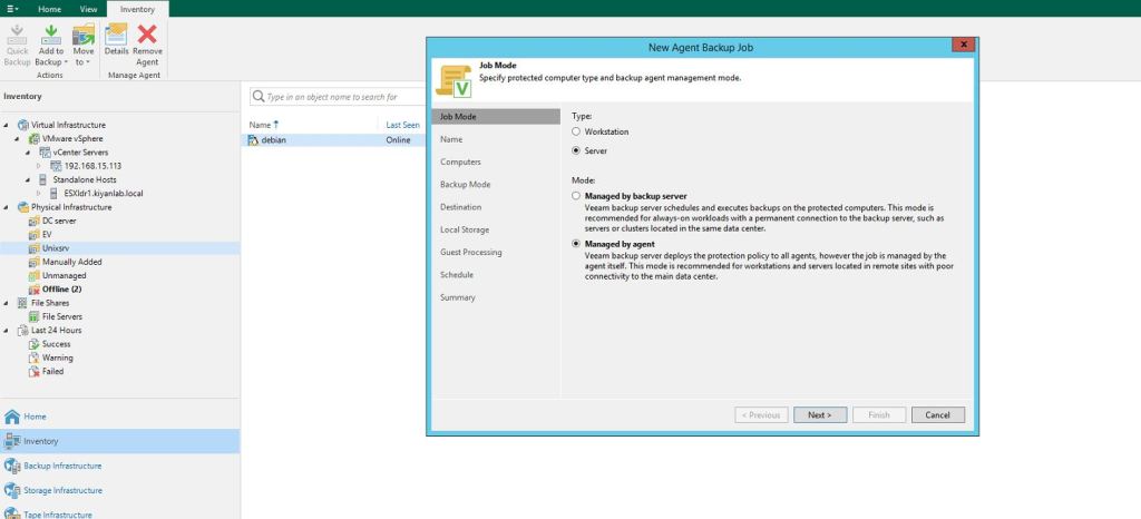 Once the registration is finished successfully, we will access our VBR console and add the new showing client to a new job.