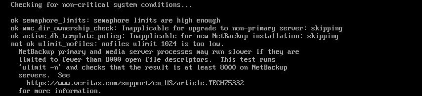 Veritas found that one of the setting in my environment does not match the requirement, which is for number of open files access in linux,here to fix the issue, I have presses q and exited from the setup.open limits.conf with your favorate editor# vi /etc/security/limits.conf
