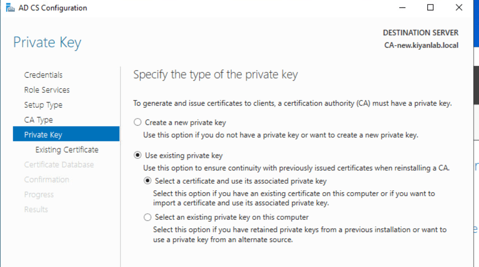 on private key, choose “existing private key: and choose “select a certificate and use its associate private key” click next