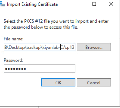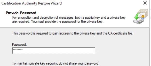 give the path to backup folder which we took from old CA server (file with p12 extention) and the password provided at the time of export on old CA,click next