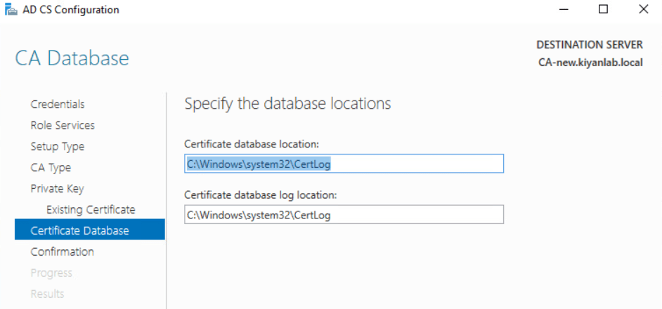 specify the database location for certificate and logs ,or keep it as it is.click next